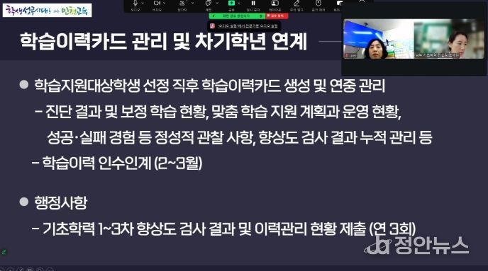 주요 내용은 ▲기초학력 보장 계획 및 예산 활용 점검 ▲학습 지원대상학생 지원협의회 운영 ▲지원 프로그램 미참여 학생 지원 방안 ▲기초학력 보장 프로그램 운영 ▲성장기록 프로그램 활용 방법 등이다.