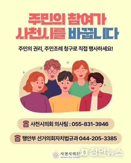 정안뉴스 김재홍 기자 | 사천시의회는 주민이 지역에 필요한 조례를 직접 제정하거나 개정·폐지할 수 있는 주민조례 청구제도의 활성화를 위해 2026년도 홍보를 더욱 강화한다고 5일 밝혔다.