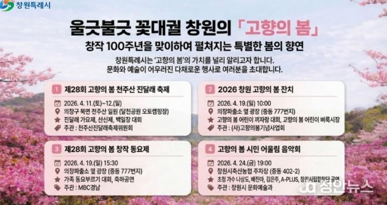 이어 4월 19일에는 의창파출소 옆 광장(중동 777번지 일원) 특설무대에서 '2026 창원 고향의 봄 잔치'와 '제28회 고향의봄 창작 동요제'가 함께 개최된다.