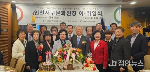 정안뉴스 안정주 기자 | 인천광역시 서구문화원은 지난 3일 이임하는 정군섭 원장에게 감사의 뜻을 전하고 취임하는 원부희 원장의 새로운 출발을 알리기 위한 이·취임식을 개최했다.