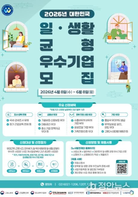 정안뉴스 안정주 기자 | 노동자의 일·생활 균형을 적극적으로 실천하는 기업이 인재 확보에 성과를 거두고 있다. 고용노동부는 이러한 우수사례 확산을 위해 산업통상부, 중소벤처기업부, 한국노동조합총연맹, 한국경영자총협회, 대한상공회의소, 중소기업중앙회와 함께 「대한민국 일・생활 균형 우수기업」을 4월 8일부터 모집한다고 밝혔다.