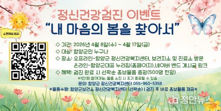 정안뉴스 김재홍 기자 | 함양군보건소 정신건강복지센터는 자살률이 급증하는 봄철 자살 고위험시기(3~5월)를 맞아, 지역 주민의 정신건강 증진과 자살 고위험군 조기 발굴을 위한 ‘정신건강검진 이벤트’를 오는 4월 8일부터 17일까지 운영한다.