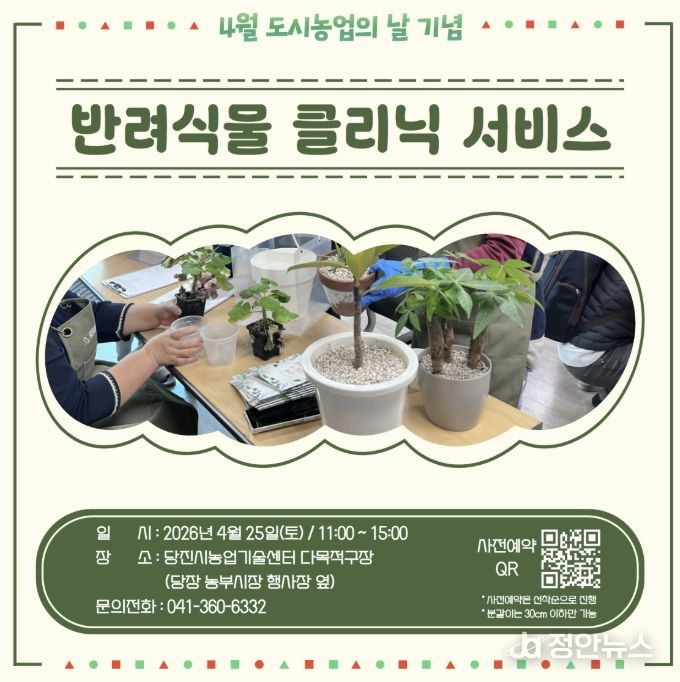 정안뉴스 안정주 기자 | 당진시는 4월 도시농업의 날을 기념하고 도시농업을 널리 알리기 위해 오는 25일 오전 11시부터 오후 3시까지 농업기술센터 다목적구장에서 ‘반려식물 클리닉 서비스’를 운영한다고 17일 밝혔다.