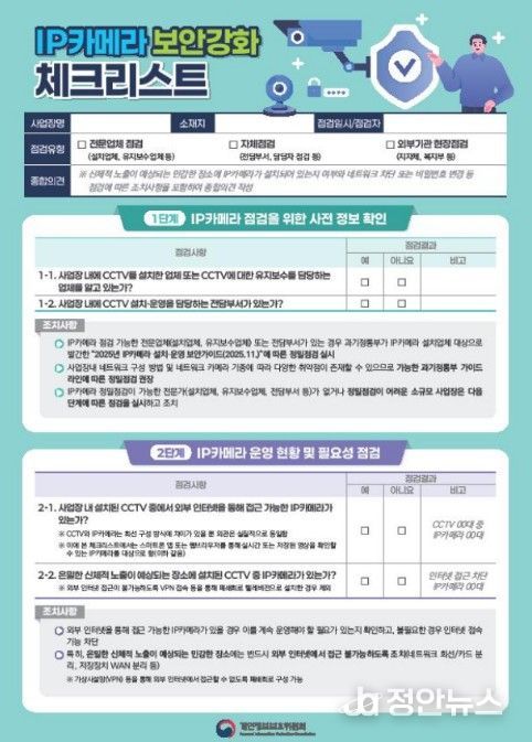 정안뉴스 안정주 기자 | 개인정보보호위원회는 지난해 12월 관계부처 합동으로 발표한 'IP카메라 보안 관리체계 고도화 방안'의 후속 조치로 관계부처, 지자체, 주요 직능단체 등과 함께 ‘IP카메라 보안 강화를 위한 민관협력 캠페인’을 추진한다.