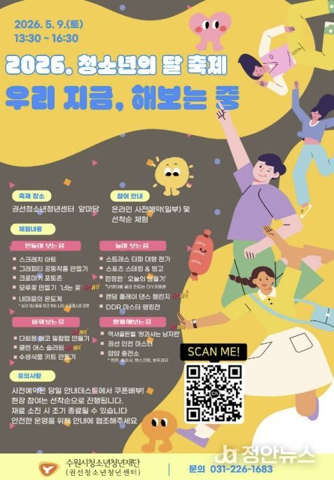 정안뉴스 안정주 기자 | 수원시청소년청년재단 권선청소년청년센터가 오는 5월 9일, 청소년이 주인공이 되어 직접 경험하고 도전하는 참여형 축제 ‘지금우리, 해보는중’을 개최한다고 밝혔다.