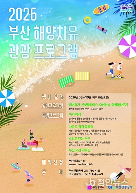 정안뉴스 안정주 기자 | 부산시는 오는 5월 1일부터 10월까지 매주 토·일요일에 부산의 7개 해수욕장(해운대, 송정, 광안리, 송도, 다대포, 일광, 임랑)과 동백섬 일원에서 '2026 해양치유 관광 프로그램'을 운영한다고 밝혔다.