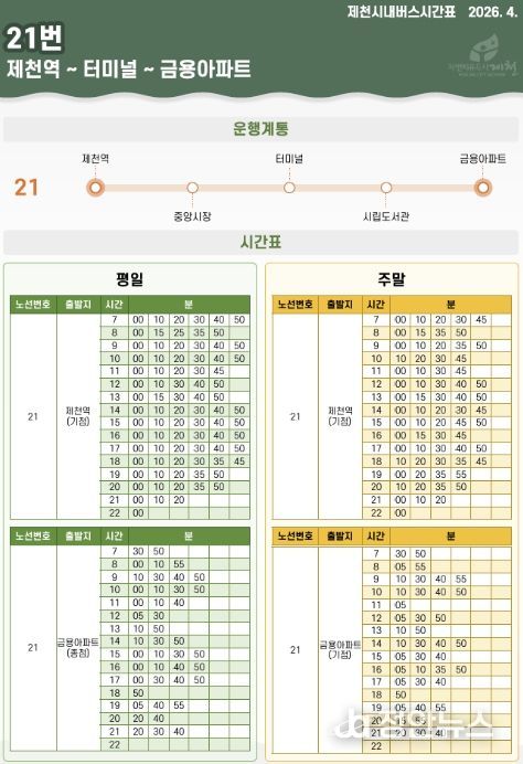 바뀐 시간표는 제천시청 누리집에서 내려받아 활용할 수 있다. 정류장 부착용 시간표 교체는 예산 확보와 인쇄 및 설치 일정 조율을 거쳐 이용객이 많은 주요 거점 정류장부터 순차적으로 진행할 예정이다.