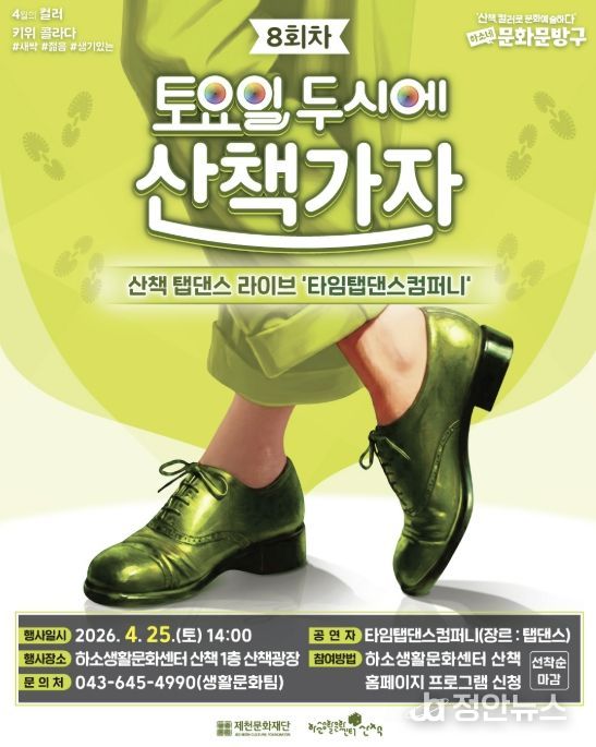 정안뉴스 안정주 기자 | 제천문화재단이 운영하는 하소생활문화센터 ‘산책’에서 매주 토요일 시민들과 함께하는 문화예술 프로그램 '토요일 두시에 산책가자'의 여덟 번째 무대로 ‘탭댄스 공연’을 선보인다.