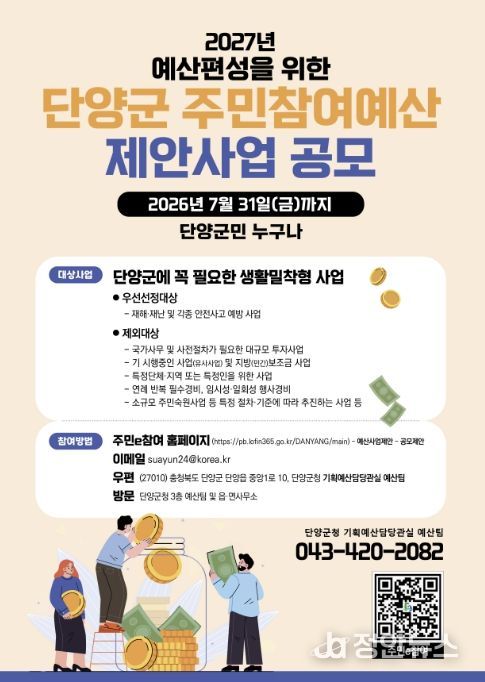 정안뉴스 안정주 기자 | 단양군은 군민이 예산편성 과정에 직접 참여해 지역에 꼭 필요한 사업을 제안할 수 있도록 ‘2027년 예산편성을 위한 주민참여예산 제안사업 공모’를 실시한다고 밝혔다.