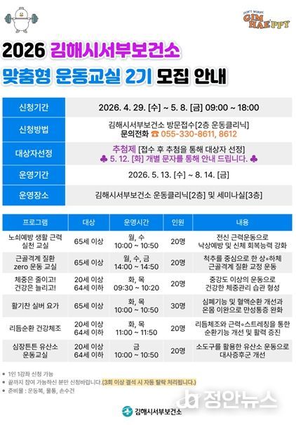 정안뉴스 김재홍 기자 | 김해시서부보건소에서 오는 29일부터 5월 8일까지 『2026년 맞춤형 운동교실 2기』 신규 참여자를 모집한다.
