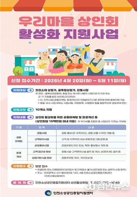 사업 신청 접수는 4월 20일부터 5월 11일까지 진행되며, 자세한 사항은 인천소상공인종합지원센터 누리집 및 인천소상공인종합지원포털 성장대로를 통해 확인할 수 있다.