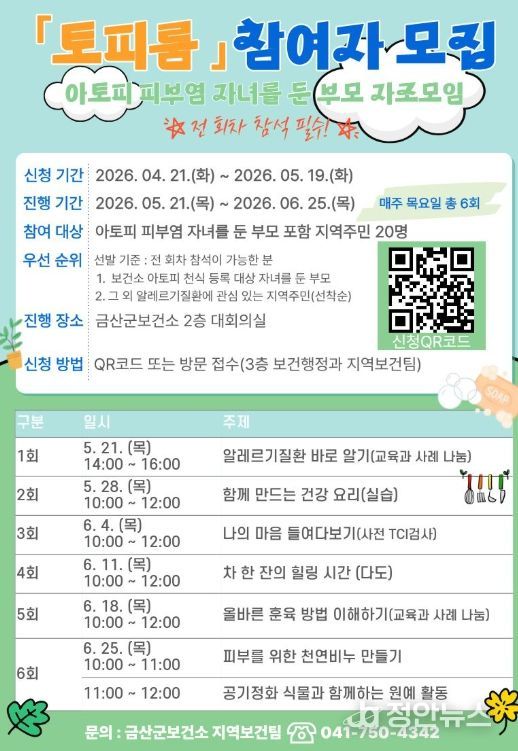 정안뉴스 안정주 기자 | 금산군보건소는 아토피 피부염 자녀를 둔 부모의 정서적 지지와 올바른 건강관리 역량 강화를 위해 5월 19일까지 부모 자조모임 ‘토피룸’ 참여자를 모집한다.