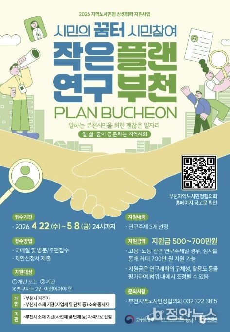 정안뉴스 안정주 기자 | 부천시는 부천지역노사민정협의회가 지역 노사민정 상생협력 지원사업의 일환으로 시민참여형 연구 공모사업 ‘플랜부천(Plan Bucheon)’을 추진한다고 28일 밝혔다.
