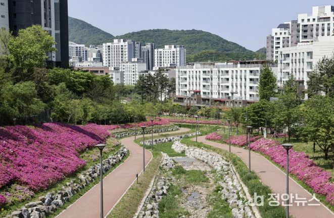 정안뉴스 안정주 기자 | 의왕시 백운밸리 지역의 생태 소하천 ‘바라천’이 봄을 맞아 화사한 철쭉(자산홍)으로 물들었다. 총길이 약 1km에 이르는 이 산책로에는 분홍빛 철쭉이 줄지어 피어나며 방문객들에게 아름다운 풍경을 선사하고 있다.