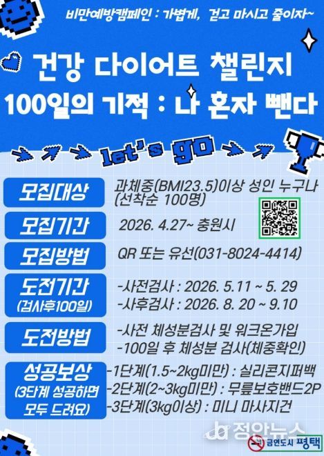 정안뉴스 안정주 기자 | 평택시는 시민들이 스스로 비만 관리 능력을 키우고 건강한 생활 습관을 정착시킬 수 있도록 돕는 비만 예방 프로그램 '100일의 기적’참가자를 모집한다고 밝혔다.
