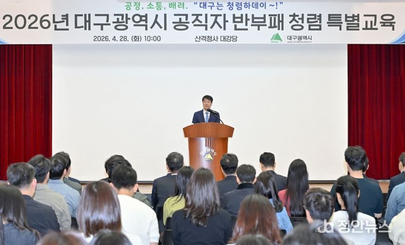 정안뉴스 안정주 기자 | 대구광역시는 4월 28일 산격청사 대강당에서 김정기 대구시장 권한대행을 비롯한 고위공직자 및 신규·승진 공무원 등 200여 명이 참석한 가운데 ‘2026년 반부패·청렴 특별교육 및 청렴 결의대회’를 개최했다.