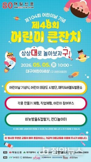 정안뉴스 안정주 기자 | 대구광역시는 제104회 어린이날을 맞아 어린이와 온 가족이 함께 즐길 수 있는 풍성한 문화·체험 행사를 시 전역에서 개최한다.