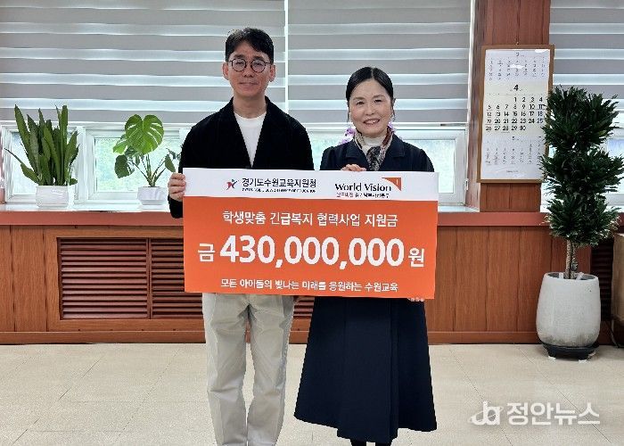 정안뉴스 안정주 기자 | 수원교육지원청은 오는 4월 28일, 영화청사 교육장실에서 월드비전 경기남부사업본부와 함께‘2026 학생맞춤 긴급복지 지원사업 지원금 전달식’을 개최한다고 밝혔다.