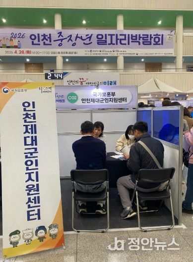 정안뉴스 안정주 기자 | 국가보훈부 인천보훈지청 제대군인지원센터는 2026. 4. 28.에 인천광역시 주최로 개최된 ‘2026 인천 중장년 일자리박람회’에 협업기관으로 참여하여 중장년 제대군인의 효율적인 취업지원을 위한 구인구직 행사를 진행했다.