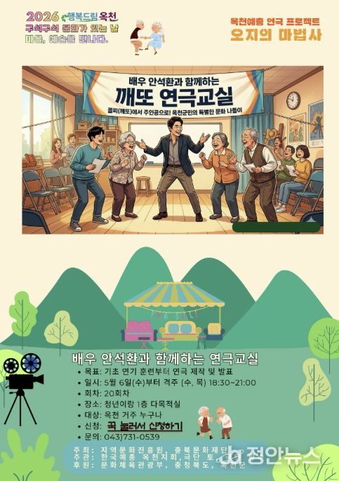 정안뉴스 안정주 기자 | 옥천군은 29일부터 문화가 있는 날 ‘청년이랑’ 1층 다목적실에서 배우 안석환과 함께하는 ‘연극교실’을 본격 운영한다고 밝혔다.