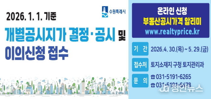 정안뉴스 안정주 기자 | 수원시 권선구는 4월 30일 결정·공시되는 개별공시지가에 대해 4월 30일부터 5월 29일까지 이의신청을 접수한다고 밝혔다.