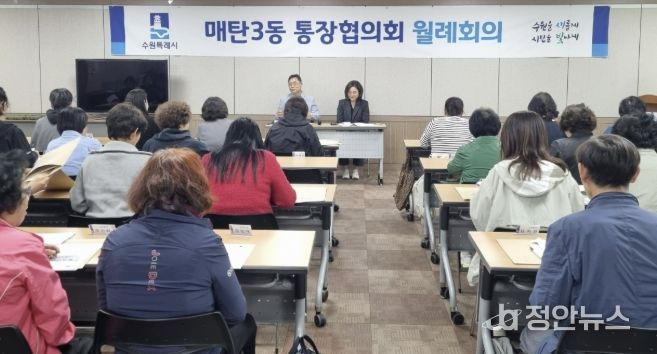 정안뉴스 안정주 기자 | 수원시 영통구 매탄3동은 지난 28일 시정 및 동정 소식 공유를 위해 4월 2차 통장협의회 월례회의를 개최했다.