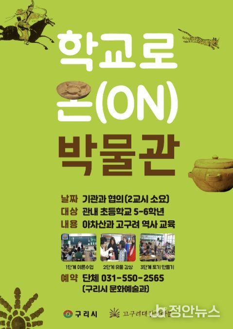 정안뉴스 안정주 기자 | 구리시는 4월 28일부터 오는 9월까지 고구려 유물 상자를 들고 관내 초등학교를 찾아가는 ‘학교로 온(ON) 박물관’프로그램을 운영한다고 밝혔다.