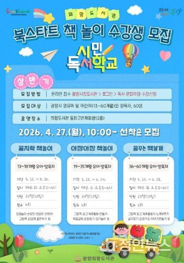 정안뉴스 안정주 기자 | 광양희망도서관은 ‘2026년 상반기 시민독서학교’의 일환으로 영유아 대상 ‘북스타트 책놀이’ 프로그램 수강생을 모집하고 있다.