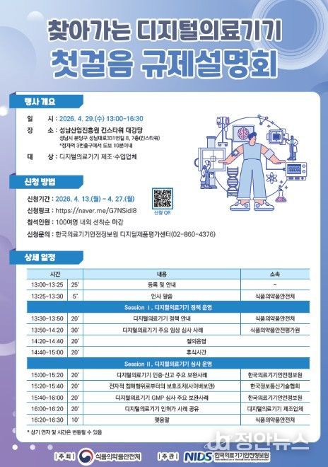 정안뉴스 안정주 기자 | 식품의약품안전처는 디지털의료기기 분야 청년 기업이 밀집한 지역을 직접 찾아가 현장의 목소리를 청취하는 ‘찾아가는 규제설명회’를 4월 29일 성남산업진흥원 킨스타워(경기도 성남시 소재)에서 개최한다고 밝혔다.