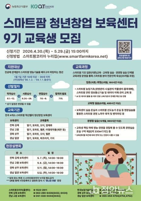 정안뉴스 안정주 기자 | 농림축산식품부는 4월 30일부터'스마트팜 청년창업 보육센터'의 2026년 신규 교육생을 모집한다.