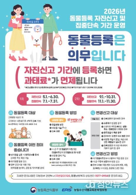 정안뉴스 안정주 기자 | 농림축산식품부는 5월부터 7월까지 동물등록 미등록자 및 미신고자를 대상으로 동물등록 자진신고 및 집중 단속기간을 운영한다.