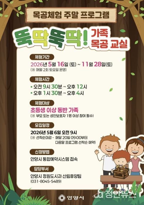정안뉴스 안정주 기자 | 안양시는 초등학생과 가족이 함께 참여할 수 있는 목공체험 주말 프로그램인 ‘뚝딱뚝딱! 가족 목공 교실’을 운영한다고 30일 밝혔다.