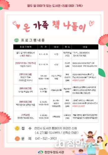 이충미 두정도서관장은 “가정의달을 맞아 가족과 함께 도서관에서 의미있는 시간을 보내시길 바란다”고 말했다.