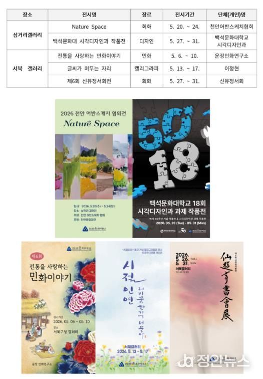 삼거리 갤러리에서는 △20~ 24일, ‘Nature Space’ 회화전 △27~ 31일, 백석문화대 시각디자인과 작품전이 열린다.