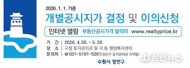 정안뉴스 안정주 기자 | 수원시 장안구는 2026년 1월 1일 기준 장안구 관내 26,934필지에 대한 개별공시지가를 4월 30일에 결정·공시하고, 다음 달 29일까지 이의신청 접수를 받는다고 밝혔다.