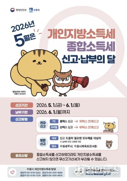 정안뉴스 안정주 기자 | 수원시 장안구는 2026년 개인지방소득세 신고·납부의 달을 맞아, 지난해 12월 31일 기준으로 장안구 내 주소지를 둔 개인은 5월 1일부터 6월 1일까지 개인지방소득세를 신고·납부해야 한다고 밝혔다.