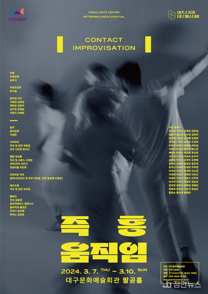대구의 전문 예술인과 시민들이 함께 즉흥으로 호흡을 맞춰 무대를 만들어 가는 대구문화예술회관 기획공연 ‘아츠스프링 대구 페스티벌-즉흥 움직임’이 3월 7일(목) ~ 10일(일) 대구문화예술회관 팔공홀에서 펼쳐진다.