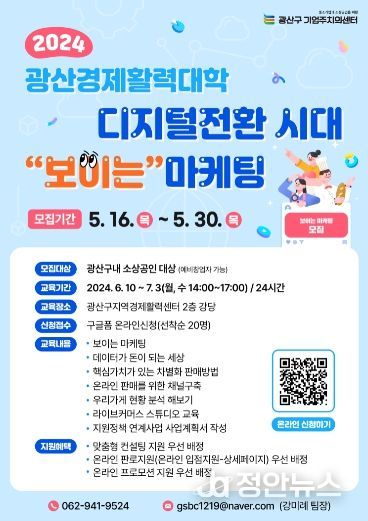정안뉴스 박상욱 기자 | 광주 광산구는 6월부터 소상공인을 위한 ‘디지털 전환 시대에 보이는 마케팅’ 전략 교육 과정으로 구성한 광산경제활력대학 4기를 운영한다고 밝혔다.