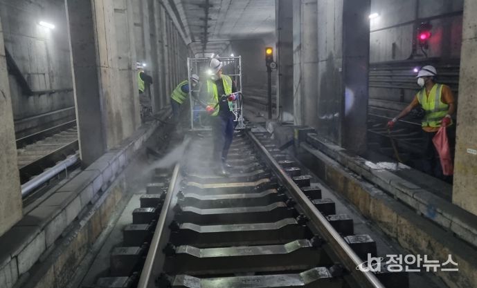 청소는 고압세척기와 세척제를 사용해 터널 선로 바닥, 벽체 등에 직접 고압 살수하는 방식으로 실시되며, 이를 통해 일반 청소로는 제거가 힘든 분진을 물로 씻어내 제거하고 배수로의 폐기물을 수거해 터널 내 환경을 정화하고 있다.