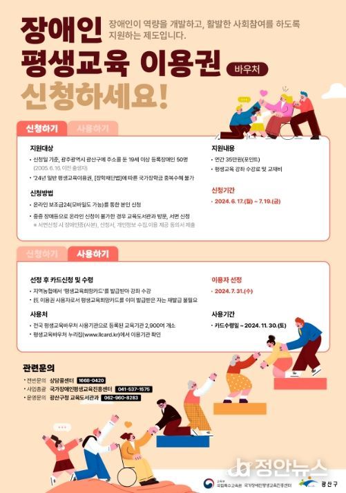 정안뉴스 박상욱 기자 | 광주광역시 광산구는 17일부터 장애인의 평생교육 참여 기회를 확대하고 평생학습 역량 개발을 지원하기 위한 ‘장애인평생교육이용권’ 신청을 받는다고 밝혔다.