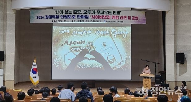 정안뉴스 박상욱 기자 | 광주동부교육지원청 특수교육지원센터가 12일 광주교육시민협치진흥원 대강당에서 장애학생 인권보호를 위한 '사이버범죄 예방 강연 및 공연' 행사를 개최했다.