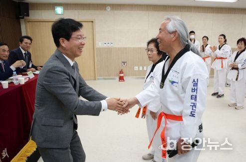 정안뉴스 박상욱 기자 | 박병규 광산구청장이 20일 광산구보건소에서 진행된 ‘으라차차 건강 태권도’ 통합 승급심사 현장을 찾아 전원 승급에 성공한 참여 어르신들과 기쁨을 나눴다.