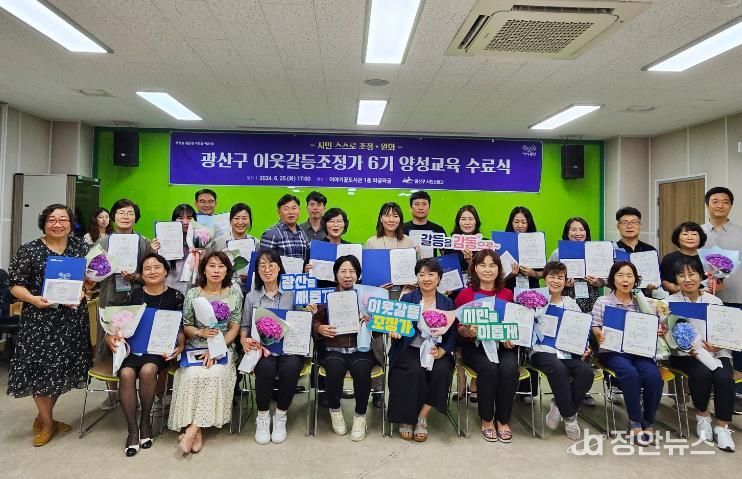 정안뉴스 박상욱 기자 | 광주 광산구는 지난 25일 이야기꽃도서관에서 ‘이웃갈등조정가 제6기 양성 교육 수료식'을 열어 다양한 이웃 간 갈등을 조정하고 완화하는 역량을 기른 24명의 시민에게 수료증을 전달했다고 밝혔다.