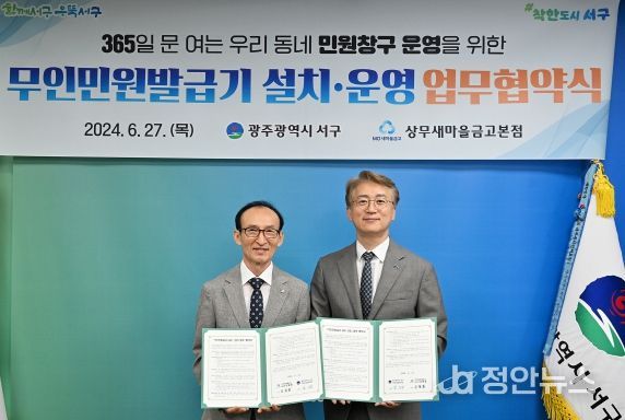 정안뉴스 박상욱 기자 | 광주광역시 서구와 상무새마을금고가 주민들의 민원 편의 증진을 위해 손을 맞잡았다. 양 기관은 27일 상무새마을금고 본점 내 무인민원발급기를 신규 설치하고, 상호 협력관계를 바탕으로 효율적인 운영을 위해 업무협약을 체결했다.