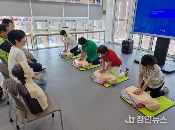 동부소방서 119 재난대응단을 초빙해 진행된 이번 교육은 ▲화재·응급상황 시 대응 요령 ▲심폐소생술 교육·실습 ▲투척용 소화기 사용법 등이다.