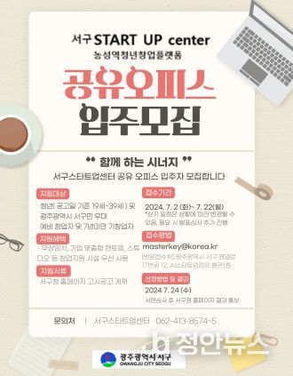 정안뉴스 박상욱 기자 | 광주광역시 서구가 오는 22일까지 ‘서구 스타트업 센터 공유사무실 입주기업’6팀을 모집한다.