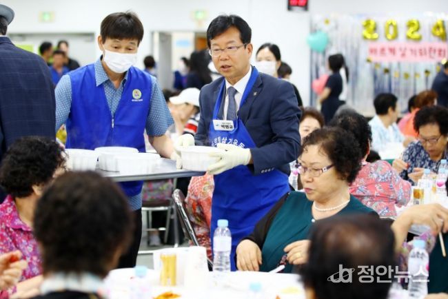 정안뉴스 박상욱 기자 | 박병규 광산구청장이 12일 초복을 앞두고 지역 어르신들의 건강을 응원하며 건강 삼계탕 배식 봉사를 펼쳤다.
