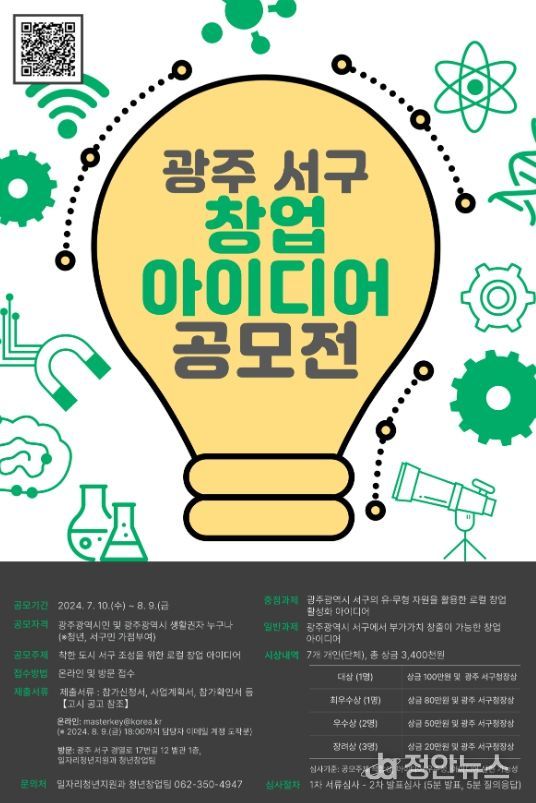 정안뉴스 박상욱 기자 | 광주광역시 서구가 지역 기반의 창업 활성화를 위해 다음달 9일까지 ‘창업 아이디어 공모전’ 참여자를 모집한다.