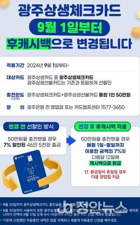 정안뉴스 박상욱 기자 | 광주상생체크카드의 할인방식이 오는 9월 1일부터 선 할인에서 사용 후 캐시백으로 지원하는 방식으로 변경된다.