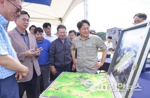 이후 강 시장과 김 군수는 공항 조성 현장을 찾아 실제 사업부지를 축소해 한눈에 볼 수 있는 모형 조감도를 통해 활주로, 소음완충지역 등 시설배치 계획을 살펴봤다.
